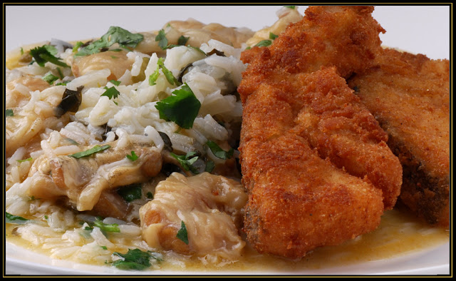 Quando sentir o arroz quase cozido corte o lume e adicione os coentros picados e envolva bem;