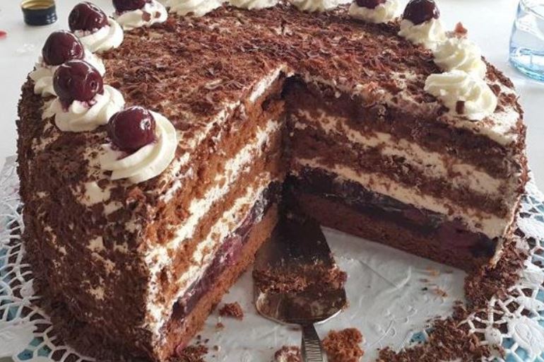 Cobertura:Bater as natas até que fiquem bem firmes, adicionar o açúcar e bater mais um pouco. Coloque uma parte do bolo sobre o prato de servir. Regue com metade da calda, e distribua as cerejas uniformemente. Por cima coloque uma camada de natas e de seguida a outra camada de bolo. Regue com a restante calda e cubra o bolo com as restantes natas. Decore o bolo com lascas de chocolate e cerejas. Coloque no frigorífico até servir.