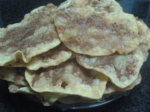 Numa frigideira aqueça o óleo. Retire pedaços de massa do tamanho de um ovo, e usando as duas mãos abra a massa do meio para os lados, de maneira que fique mais fina no meio e grossa nos bordos. Coloque no óleo bem quente e deixe fritar, até ficarem douradas. Cuidado para que não queimem, se achar que o óleo está demasiado quente, reduza a temperatura. Depois de fritas, retiram-se do lume, deixam-se escorrer em papel absorvente e passam-se por açúcar misturado com canela em pó.