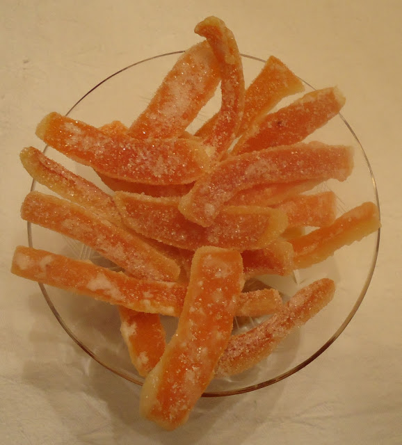 Retire algumas cascas do tacho e coloque-as   numa tigela com açúcar. Agite a tigela para que as cascas fiquem cobertas por igual.