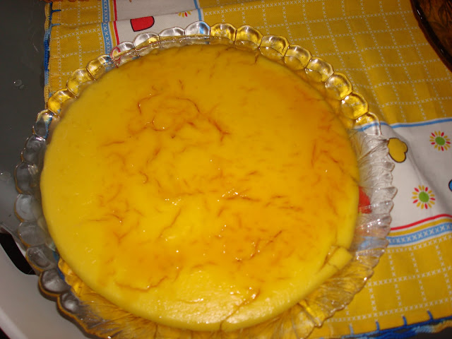 Colocar a base de bolo num prato de servir e voltar a colocar o aro, verter o creme sobre a base e alisar a superfície.
