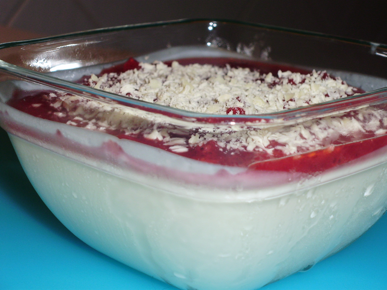 Aos poucos, juntar a gelatina com as natas. Se ainda estiver quente deixar arrefecer mais um pouco. (Eu acho que a minha gelatina ainda estava um pouco quente pois ela separou-se do restante preparado)