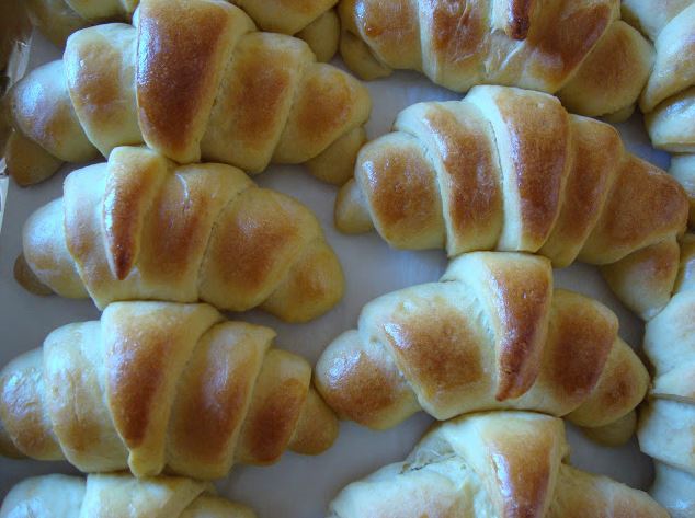 Colocar os ingredientes todos na cuba da máquina, e programar para amassar. Depois dividir a massa em duas partes, esticar na bancada enfarinhada em rectângulo e cortar triângulos, pincelá-los com água e enrolar a partir da parte mais larga.