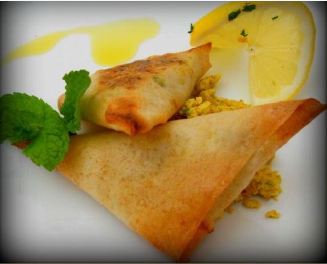 Comece a dobrar as chamuças (ver diagrama), fechar as extremidades pincelando com um pouco de água morna.